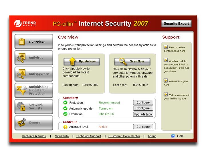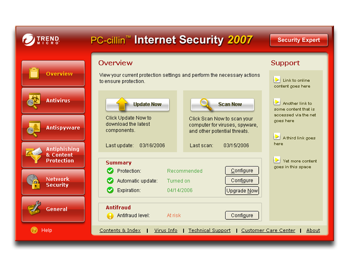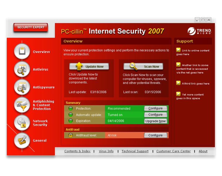 UI treatments for Trend Micro PC-cillin threat protection application.